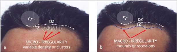 Transition zone (TZ): The most anterior zone of the frontal hairline. It should appear soft and irregular containing both micro- and macro-irregularity.