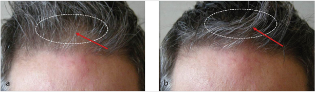 Fig. 40.5 The importance of density in the defined zone. (a) The defined zone is thinning and the hairline appears see-through. (b) The hairline looks much fuller, but NO hairs were added to the transition zone. Hair was only manually compressed in the defined zone, making it less see-through. This indirectly made the transition zone look fuller.