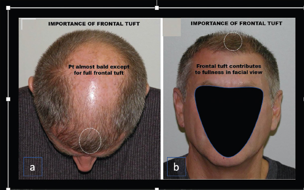 Fig. 40.6 The importance of the frontal tuft. (a) From a frontal view, the patient appears to have a fairly full head of hair thanks solely to this tuft. (b) From the top view, he looks bald.