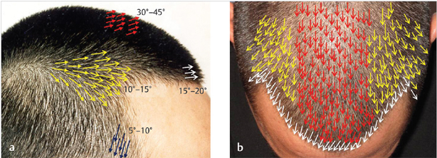 Angle and direction are distinct entities. Angle refers to the degree of elevation hair has as it exits the scalp. Direction refers to the way hair points (right or left) when leaving the scalp. It is important to pay attention to changes in both angle and direction as one transplants different parts of the hairline (Fig. 40.7). Often there are residual miniaturized hairs that act as a road map for the physician to follow. Typically, the following pattern is seen: