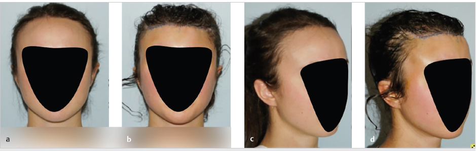 Fig. 86.1 Female with congenital high hairline before and after hairline-lowering procedure. (a) Frontal view immediate pre-op. (b) Frontal view immediate postoperative results following 2.5 cm of hairline lowering. (c) Lateral view pre-op. (d) Frontal view post-op.