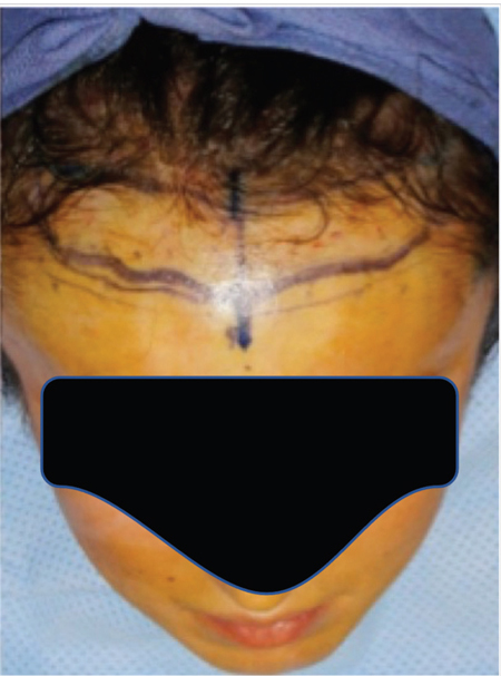 Preoperatively, the existing hairline is marked in an irregular, undulating pattern just posterior to the fine vellus frontal hairs (Fig. 86.2). As the markings approach laterally to the downward-directed hairs of the temporal tufts, they should be curved posteriorly into the temporal hair for approximately 2 to 2.5 cm. It is important to create this marking in such a way that division of the posterior branch of the superficial temporal artery is avoided when performing the incision. Of note, women who have undergone prior scalp surgery (such as brow lifts, face-lifts, and follicular unit transplantation) can undergo surgical hairline lowering if their key arteries can be identified by Doppler examination. The desired neo-hairline height is then chosen at a point over the forehead, and a marking is made replicating the natural hairline above.