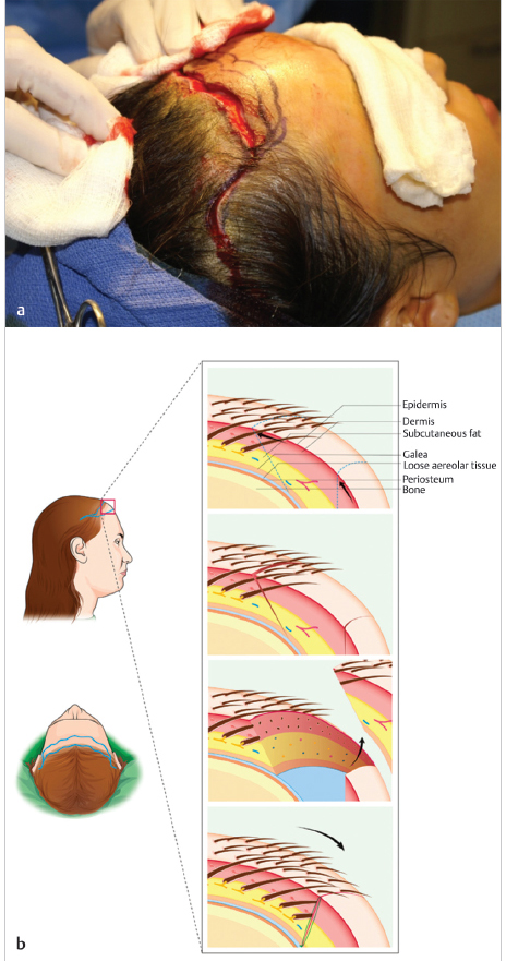 •A two-stage procedure with scalp expansion before advancement is required in those with minimal laxity or significantly high hairlines.