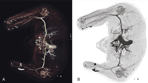 (A,B) CT angiography of bilateral upper extremity amputee with shrapnel present demonstrating patency and course of the bilateral brachial arteries with premature termination of both brachial arteries approximately 5 cm proximal to level of amputation.
