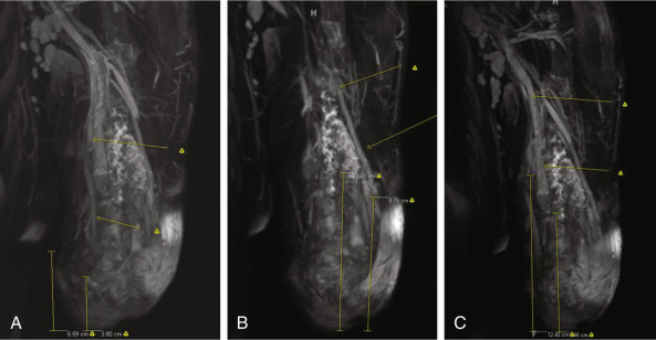 MR neurography demonstrating peripheral nerve end neuroma location and length being much more proximal than the level of amputation. (A) Ulnar nerve; (B) radial nerve; (C) median nerve.