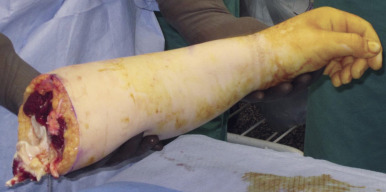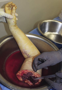 For concurrent procurements, the arm(s) are on a hand surgery table 90° to the operating table. All surgical teams simultaneously prep and drape with full exposure of the arm to the axilla ( Fig. 65.5 ). A tourniquet is inflated after minimal exsanguination, or in the case of proximal upper arm procurement, a non-pneumatic tourniquet is placed, which is self-exsanguinating and secured to the arm in the region overlying the deltoid muscle with penetrating clamps. This tourniquet will be left inflated and/or in place until all organ procurements have been completed. A guillotine incision is outlined and the medial/volar component created first with dissection down through the nerves to the brachial artery/veins. Any divided nerves are tagged if there is potential for any later question of identity. The brachial artery is isolated. It is ligated proximally and distal control is obtained. The largest catheter possible is used to cannulate the artery and this is secured with suture. The veins are clipped or ligated proximally and cut distally. The procedure then proceeds rapidly from medial/anterior to lateral/posterior dividing muscle with cautery and either disarticulating the elbow or performing an osteotomy with a power saw through the humerus. Once the limb is completely detached, it is immediately taken to the back-table, where perfusion solution is instilled ( Fig. 65.6 ). The solution is instilled until at least 500 mL have been infused or all effluent is clear. Typically perfusion volume ranges between 500 mL and 1000 mL. Note is made of which venous system the dominant drainage of infusion is coming from (brachial veins vs superficial veins), as this system will be critical for outflow, though in reality every single vein capable of anastomosis should be anastomosed . The arm is then wrapped in moist gauze and placed in standard sterile triple bag containment identical to that of solid organ transplantation, placed on ice, and secured in a cooler.