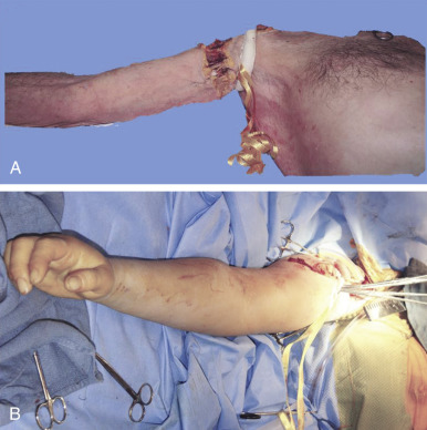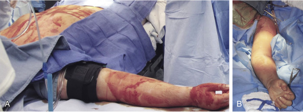 Procurements are coordinated by the regional organ procurement organization (OPO) and will likely involve teams for procurement of abdominal and thoracic organs. Priority of course, is given to maintaining the viability of life-saving organs during the procurement, so any process that has significant potential to endanger them will be terminated by the OPO coordinator. The upper extremity procurement level depends on the specific donation. For distal forearm and mid-forearm transplants, an elbow disarticulation is usually adequate in providing soft tissue, vessel length, nerve length, and extra skin/bone for grafting as needed ( Fig. 65.3 ). For distal transhumeral transplants, we recommend a proximal humeral procurement at the highest level that tourniquet control can be still be maintained. The authors have used a thin, non-pneumatic tourniquet (HemaClear, OHK Medical Devices, Inc, Grandville, MI) placed as high on the arm as possible over the deltoid with the tourniquet fixed to the skin with penetrating clamps to help prevent slippage ( Fig. 65.4 ). For middle or proximal arm procurements, control may be required via intrathoracic cannulation and control of the subclavian vessels by the thoracic procurement team.