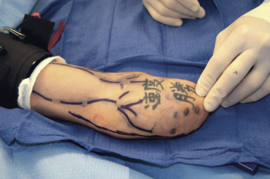 The authors have found preoperative placement of peripheral nerve catheters for postoperative pain management and theoretical benefit of chemosympathectomy to be helpful. A key point is to not dose the pain catheters with a long-acting agent prior to surgery. Surgical stimulation at the operative site may be necessary to maintain the patients at a normotensive level without undue amounts of crystalloid support, which can contribute toward coagulopathy. Central venous lines and an arterial line are placed prior to beginning surgery. The immunological induction agent is given at this time. The ultrasound machine used by the anesthesiology group for peripheral nerve catheter and vascular access catheter placement is then used by the surgical team to map peripheral veins on the recipient limb. These are marked with a permanent marker (as opposed to a surgical marker, which washes off too easily) to locate veins during the operation ( Fig. 65.7 ).