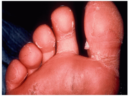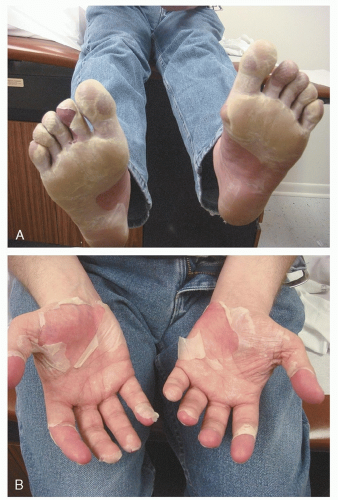 During the convalescent phase of the illness, the skin of the palms and soles frequently desquamates. The desquamation may be sheet-like (Fig. 14-1, A and B).