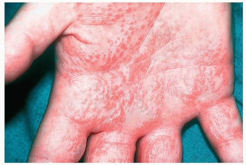 ![]() Figure 14-15 Palmar psoriasis. These erythematous lesions are well-demarcated and symmetrical in distribution. |