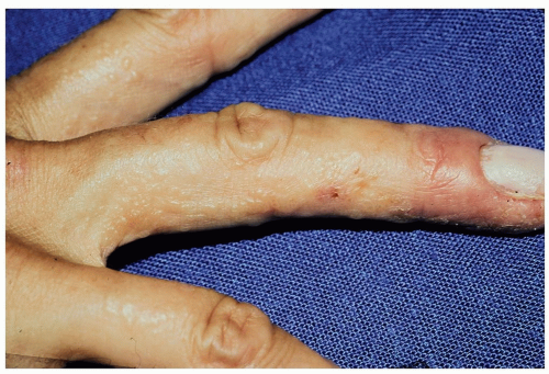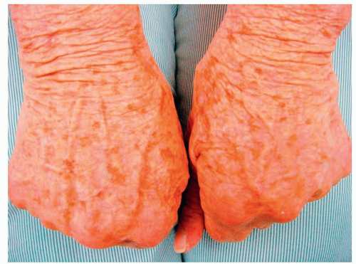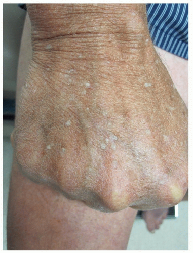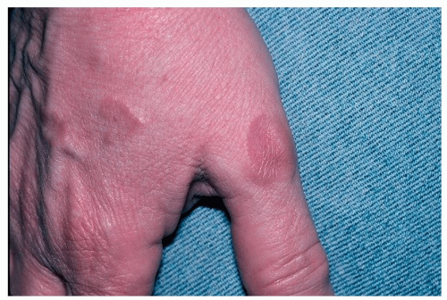 Lesions are red, pink, or skin-colored firm dermal papules that most often arise on the dorsal surfaces of the hands, fingers, and feet (see Fig. 19-14), less often, on the extensor aspects of the arms and legs