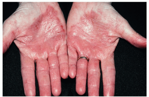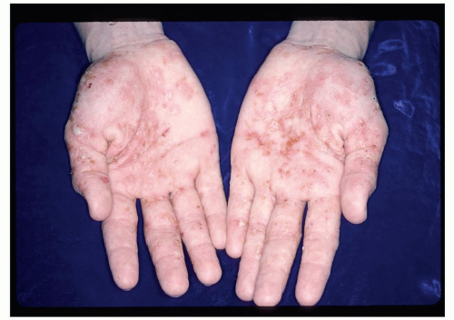 Hand eczema is a very common condition that is seen most often in those who have an underlying atopic predisposition. For descriptive purposes, Hand and foot eczema may be divided into two clinical presentations: a “wet” dyshidrotic type and a “dry,” hyperkeratotic, scaly type. The term dyshidrotic is a misnomer based on the erroneous assumption that the eczematous vesicles are caused by trapped sweat. We now understand that the vesicles result from inflammation and foci of intercellular edema (spongiosis), which becomes loculated in the thick stratum corneum.
