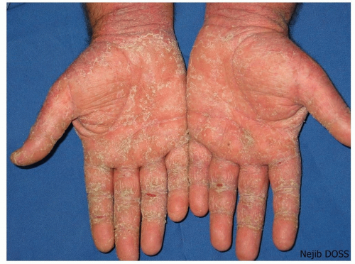 Lesions of palmoplantar psoriasis may involve the palms and/or soles alone, or these areas may be a part of more extensive psoriasis that is also present elsewhere on the body. The involvement of the palms and soles often presents additional problems such as pain, impairment of function, fissuring, bleeding, and embarrassment. As with chronic hand eczema (described above), palmar psoriasis runs a chronic course and is often quite difficult to manage.