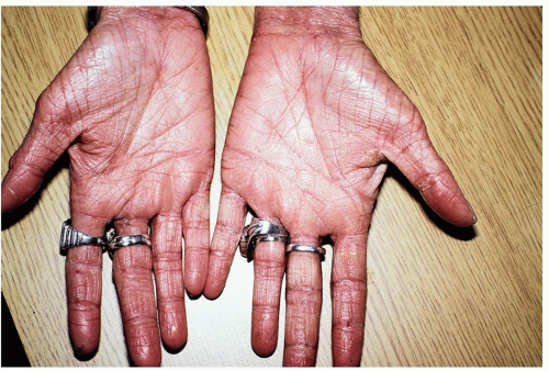 ![]() Figure 14-14 Hyperlinear palms. This is a common finding that is often noted in those with chronic atopic hand eczema. |