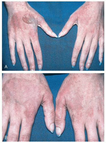 The hands and fingers are the workhorses of the body, constantly in contact with, and exposed regularly to the external environment in all seasons. Sun exposure, soaps, and other harsh contactants are daily insults and irritants. Fortunately, the palmar surfaces are adapted with a thick stratum corneum that is a much more resilient barrier than the stratum corneum on the dorsal surfaces; thus, the palms experience less frequent episodes of irritant and allergic contact dermatitis. In contrast, the dorsal surfaces are much more likely to develop both irritant and allergic contact dermatitis as well as sun-induced atypical lesions.