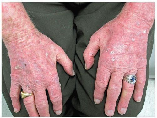 Scaly, itchy, erythematous plaques; skin surface loses flexibility and often develops painful fissures (Fig. 14-13)