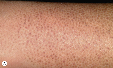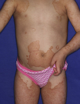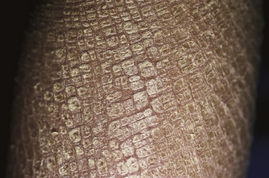 Although rare in children, “acquired” ichthyotic scaling has been described in patients with nutritional disorders such as hypovitaminosis or hypervitaminosis A, hypothyroidism, sarcoidosis, dermatomyositis, leprosy, tuberculosis, human immunodeficiency virus (HIV) infection, and neoplastic disorders, particularly lymphomas. It should be noted that these forms were described before the availability of testing for profilaggrin mutations; given the many undiagnosed patients, it is possible that the underlying condition served as a trigger for increased cutaneous inflammation or dryness that led to increased expressivity of the gene mutation. Pityriasis rotunda, a rare variant of acquired ichthyosis, is characterized by asymptomatic, circular or oval, brown scaly patches on the trunk or extremities. Seen primarily in individuals of Japanese, African, and West Indian origin, its occurrence in Caucasians is extremely rare. The condition may at times be associated with an underlying disorder, may follow pregnancy, or may be familial. In contrast to ichthyosis vulgaris, pityriasis rotunda is chronic, is resistant to treatment, and tends to improve only when the underlying disorder is treated.