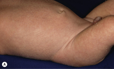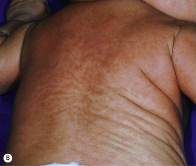 The key clinical features of Conradi–Hünermann–Happle (CHH) syndrome (also called X-linked dominant chondrodysplasia punctata type II ) are linear ichthyosis, chondrodysplasia punctata, cataracts, and short stature. Neonates tend to show severe ichthyosiform erythroderma with patterned yellowish markedly hyperkeratotic plaques ( Fig. 5-24, A ). After the first 3 to 6 months of life the erythroderma and scaling resolve, leaving erythema and later follicular atrophoderma in a distribution that follows Blaschko lines, hypopigmentation and hyperpigmented streaks particularly on the trunk ( Fig. 5-24, B and C ), and circumscribed cicatricial alopecia of the scalp and eyebrows ( Fig. 5-25 ). Patients may show persistent psoriasiform lesions in intertriginous areas (ptychotropism) ( Fig. 5-26 ). In addition to the cutaneous findings, patients with CHH show asymmetric skeletal involvement with punctate calcification of the epiphyseal regions that usually results in an asymmetric shortening of the long bones (especially the humeri and femora) and sometimes in severe kyphoscoliosis, facial dysplasia, and hip dislocation. Unilateral or bilateral sectorial cataracts; patchy, coarse, lusterless hair; nasal bone dysplasia with saddle-nose deformity (see Fig. 5-25 ), and a high-arched palate further characterize the disease. The bony abnormalities but not the skin lesions of CHH syndrome have been described in association with teratogenic exposures to medications and infections and maternal autoimmune diseases.