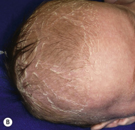 Recessive X-linked ichthyosis. Scaling may be subtle, particularly in younger infants. This 6-month-old boy was diagnosed in utero by increased maternal estradiol levels and then FISH analysis of chorionic villus samples. Note the fine scaling on the trunk (A) and the large scales on the scalp (B) .