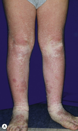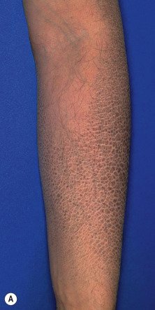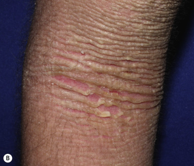 Ichthyosis vulgaris. (A) Scales are most prominent on the extensor surfaces of the extremities, especially the lower extremities. (B) The palms and soles are thickened with increased palmar markings.