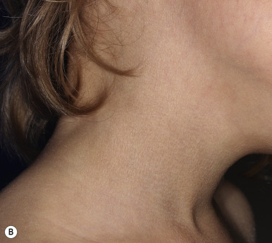 Recessive X-linked ichthyosis. (A) Scales may be large and hyperpigmented, especially in darker-skinned individuals. The popliteal and antecubital areas are typically spared. (B) The neck is typically affected with darker scaling that can appear as a dirty neck.