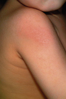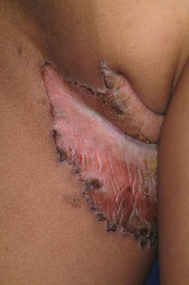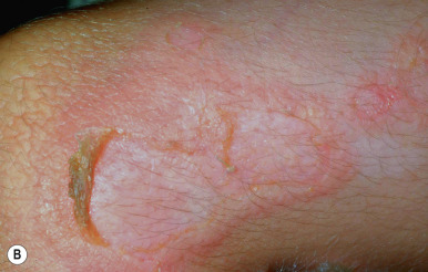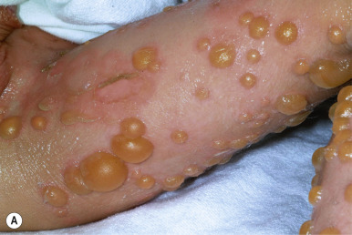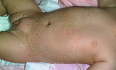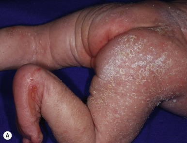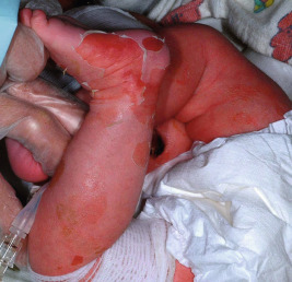 EI affects approximately 1 in 300,000 individuals, and 50% of patients have new mutations. The skin is red and may be tender at birth. Superficial bullae generally appear within the first week of life (often within a few hours after delivery; Fig. 5-4 ) and may be confused with those of epidermolysis bullosa (see Chapter 13 ) or with staphylococcal scalded skin syndrome (see Chapter 14 ). Skin thickening often appears from the third month on, but subtle thickening may be detectable during the first month of life, especially over the elbows and knees, and may be useful in suggesting the diagnosis. The blisters occur in crops and vary from 0.5 cm to several centimeters in diameter. They tend to heal quickly, consistent with their superficial location. When ruptured, they discharge clear fluid and leave raw denuded areas. Secondary bacterial infection, especially with Staphylococcus aureus , is commonly associated with this disorder.