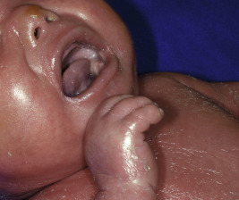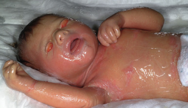 Collodion baby. Note the shiny thickened skin, mild ectropion, mild eclabium, and ear deformity. In this 5-day-old baby, the “membrane” is starting to crack and desquamate.