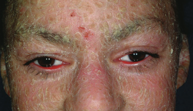 The clinical features of the classic LI phenotype may range from very mild to severe. Individuals who show the greatest severity of LI have large lamellar plate-like scales with relatively mild underlying erythroderma, ectropion (eversion of an edge or margin of the eyelid resulting in exposure of the palpebral conjunctiva) ( Fig. 5-9 ), and mild eclabium (eversion of the lips) (see Table 5-1 ). Lamellar scales are large, quadrangular, yellow to brown-black, often thick, and centrally adherent with raised edges resembling armor plates (hence the term LI ) ( Fig. 5-10 ). Scales are most prominent over the face, trunk, and extremities, with a predilection for the flexor areas. Cheeks are often red, taut, and shiny; more scales appear on the forehead than on the lower portion of the face. The palms and soles are almost always affected in LI; severity varies from increased palmar markings to a thick keratoderma with fissuring. The scalp is often scaly with scarring partial hair loss (especially with TGM1 mutations). Involvement of the nails is variable. They may be stippled, pitted, ridged, or thickened, often with marked subungual hyperkeratosis.
