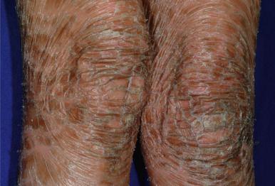 Classic nonbullous CIE is characterized by a much more prominent erythrodermic component that may first become apparent as the collodion membrane is shed; some patients show CIE at birth without a classic collodion membrane. Affected individuals show fine white scales on the face, scalp, and trunk, although scaling may be more plate-like scales on the extensor surfaces of the legs ( Fig. 5-12 ). The degree of ectropion is variable but often milder than with LI, and there is less PPK. Cicatricial alopecia is possible, and nails may show thickening and ridging. Some patients with CIE show intrauterine growth retardation and/or failure to thrive, although nutritional deficiency and gastrointestinal abnormalities are uncommon. Patients with CIE may have associated neurologic abnormalities.