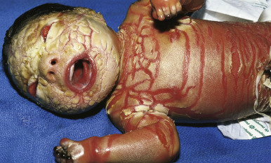 Collodion babies are often born prematurely. At birth they are completely covered by a cellophane or oiled parchment-like “membrane” that, owing to its tautness, may distort the facial features and extremities. Thus peripheral edema with digital constriction, flattened ears, and bilateral eversion of the eyelids, lips, and at times the vulva often cause affected infants to resemble one another during the first few days of life. Among the problems facing these infants are an inability to suck properly, respiratory difficulty because of restriction of chest expansion by the thick membrane, cutaneous and systemic infection, and aspiration pneumonia. Despite the thickening of the stratum corneum, this membrane is a poor barrier, leading to excessive transcutaneous fluid and electrolyte loss, hypernatremic dehydration, increased metabolic requirements, and temperature instability.