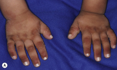 Individuals with CHIME syndrome (also called Zunich neuroectodermal syndrome ) show a combination of coloboma, heart defects, ichthyosiform dermatosis, mental retardation, and ear anomalies, including conductive hearing loss. The disorder is caused by mutations in PIGL, a de-N-acetylase required to make glycosylphosphatidylinositol (GPI) anchors, which are membrane glycolipids that anchor the C-terminus of proteins during posttranslational modification. The skin is notably thickened and dry at birth, with pruritus often developing during the first months of life ( Fig. 5-17 ). The colobomas are usually retinal, although choroidal colobomas have been described. Several heart defects, including pulmonic stenosis, ventricular septal defect, transposition of the great vessels, and tetralogy of Fallot, have been associated. Patients show a typical facies with hypertelorism; a broad, flat nasal root; upslanting palpebral fissures; epicanthic folds; a long columella but short philtrum; macrostomia; full lips; and cupped ears with rolled helices. All patients show brachydactyly. The hair may be fine and sparse, and trichorrhexis nodosa has occasionally been described. Some patients have renal or urologic anomalies, and cleft palate has been described in association.