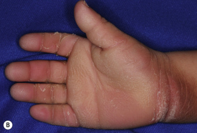 Harlequin ichthyosis. This boy survived the neonatal period without retinoid intervention and is thriving with severe erythroderma and residual deformation (now 5 years of age). Note the severe erythroderma with scaling, persistent eclabium, and residual deformities of the fingers after the harlequin scaling is shed.