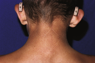 CHIME syndrome. Thickened skin on the back of the neck. Note the hearing aids because of conductive hearing loss.