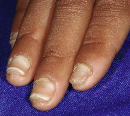 KID syndrome. Note the fine, stippled papules studding the dorsal aspect of the fingers and the subungual hyperkeratosis.