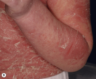 Netherton syndrome. Polycyclic scaling lesions, many showing the scale edge. (A) Note the underlying erythroderma, scalp involvement, and short hair. (B) Sometimes there is more global erythroderma and larger desquamative scaling.