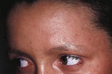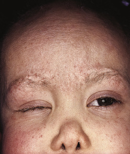 Conradi–Hünermann–Happle syndrome. Cicatricial alopecia of the eyebrows. Approximately half of this patient’s scalp hair was replaced by cicatricial alopecia as well. Note the deformity of the nose.