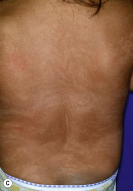 Conradi–Hünermann–Happle synd­rome. Congenital scaling (A) and re­­sidual hyperpigmentation during infancy after scale clearance (B) and later during childhood (C) in a distribution that follows Blaschko lines.