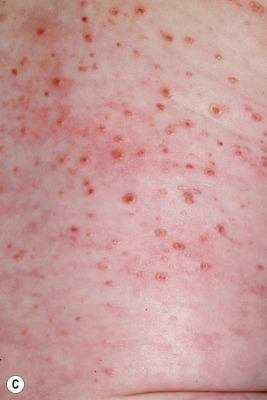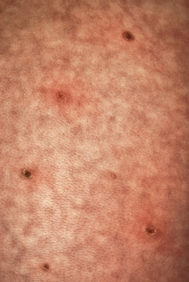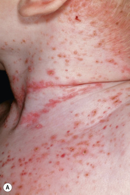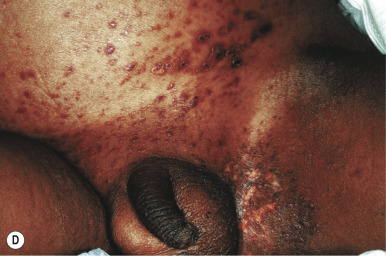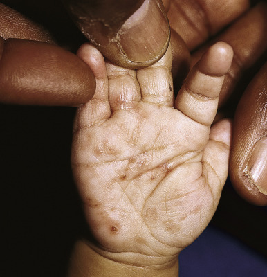 | Scaly red-brown papules | Especially in scalp, flexural areas; may have associated crusting; may be umbilicated or lichenoid; palm and sole involvement common |