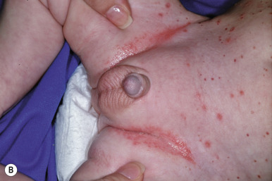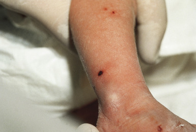 In neonates with LCH, vesiculopustular lesions ( Figs. 10-4 and 10-5 ) tend to predominate and may be misdiagnosed as congenital varicella or herpes. These lesions may become hemorrhagic or crusted. Petechiae and hemorrhage may also be present in association with the dermatitis or the papular lesions of LCH, and they may be seen both with and without associated thrombocytopenia. Other less commonly seen cutaneous presentations include nodules and granulomatous, ulcerative lesions. Box 10-2 lists some cutaneous clues to the diagnosis of LCH.