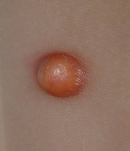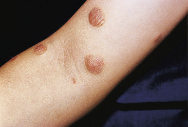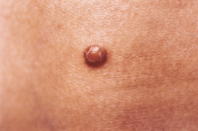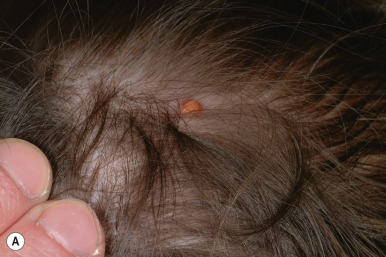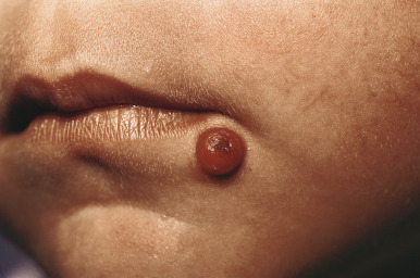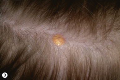 JXG presents as a firm, round papule or nodule, varying in size from 5 mm to 2 cm, with giant lesions (i.e., up to 5 or 10 cm) occasionally seen. Some authors have divided JXG into a “micronodular” form (lesions <10 mm) and a “macronodular” form (lesions >10 mm). Early JXGs are erythematous ( Fig. 10-8 ) to orange or tan ( Fig. 10-9 ), but with time they become more yellow in color ( Figs. 10-10 and 10-11 ). Lesions may be solitary (up to 90% of all patients with JXG ) or less commonly multiple ( Fig. 10-12 ), and they are usually asymptomatic. Ulceration and crusting may occasionally occur. The head, neck, and trunk are the most common areas to be involved. Lesions may also occur on mucous membranes or at mucocutaneous junctions (mouth, vaginal orifice, and perineal area). Oral lesions occur on the lateral aspects of the tongue, gingival, buccal mucosa, and midline hard palate and may ulcerate and bleed. Oral lesions may appear verrucous, pedunculated, umbilicated, or fibroma-like. Typically, the lesions of JXG present at birth (20%) or during the first 6 months of life, and they may persist or continue to erupt for years.