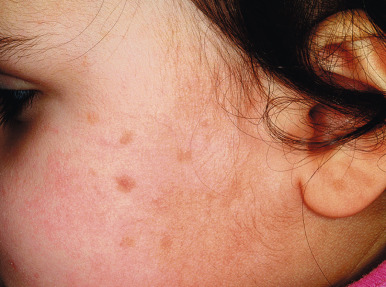 Benign cephalic histiocytosis (BCH) is a self-healing, cutaneous, non-LCH that classically involves the face and head. The average age of onset is 15 months, and 45% of cases occur in infants under 6 months of age. Clinically BCH is characterized by small, 2- to 6-mm, yellow-brown macules and minimally elevated papules ( Fig. 10-13 ). The lesions may occasionally coalesce to give a reticulate pattern. BCH most commonly occurs on the face and head (more than 80% of 45 patients in one review) and less commonly on the neck and trunk. The extremities, buttocks, and pubic area may be involved later in the course. The differential diagnosis may include flat warts, micronodular JXG, LCH, multiple melanocytic nevi, and urticaria pigmentosa.
