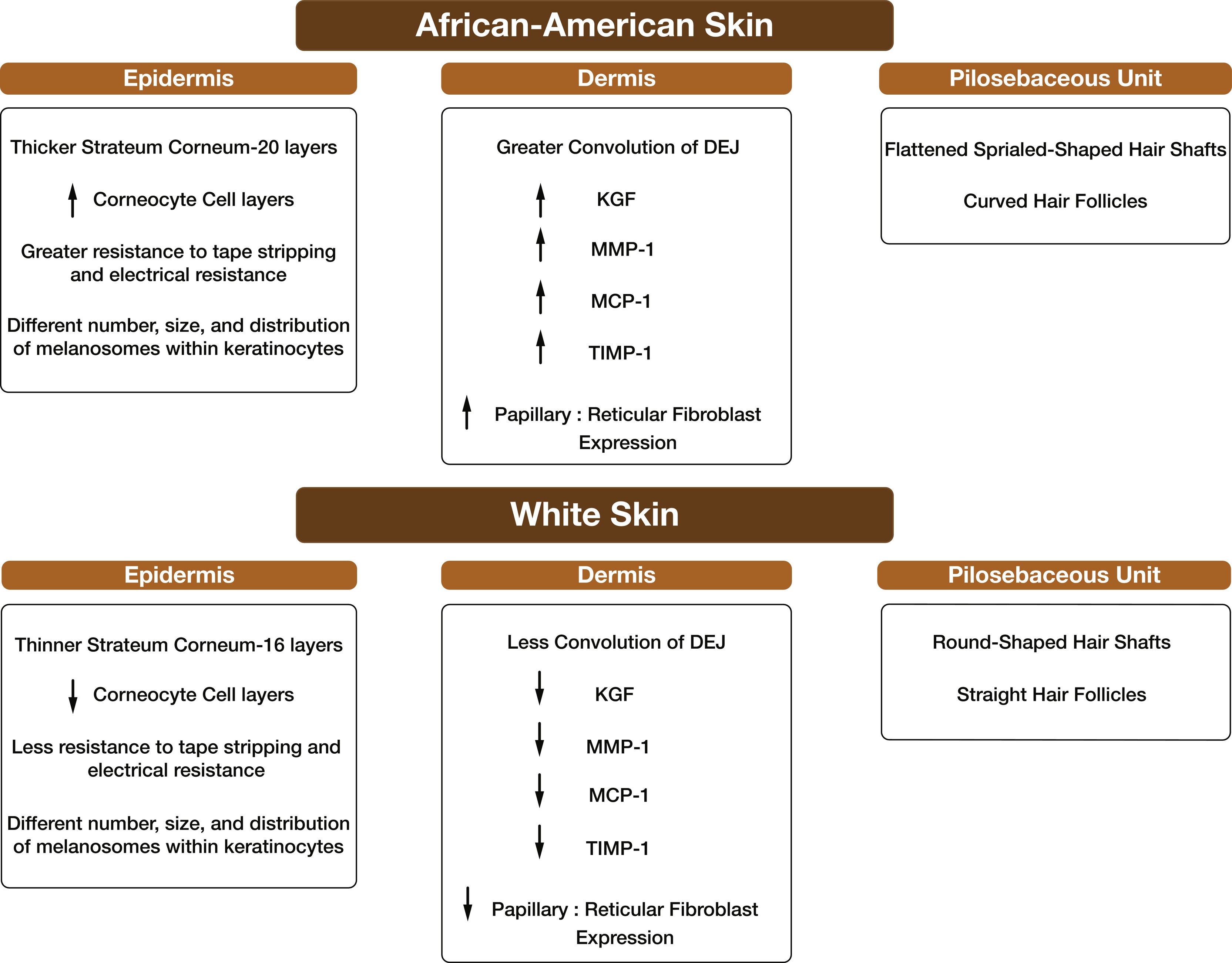Other differences in protein expression have been reported in African skin compared to White skin, including increased keratinocyte growth factor (KGF) and monocyte chemotactic protein (MCP)-1, twofold higher ratio of papillary to reticular fibroblast expression, increased matrix metalloproteinase (MMP)-1, and tissue inhibitor metalloproteinase protein (TIMP)-1 protein expression. In an inflammatory environment, these observations make black skin more prone to pathologies or disorders such as keloids/acne keloids and potentially HS.