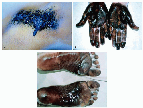 Primary hyperhidrosis is typically focal and affects anatomic areas rich in eccrine sweat glands, most often the axillae, palms, soles, face, and scalp (Figure 9.3.2).
