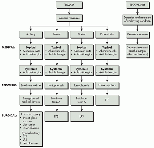 Primary hyperhidrosis is a difficult-to-manage condition. Although many treatments are now available, there is no uniform treatment for all patients and all forms with good efficacy, with permanent duration, and without adverse reactions. Current treatment of primary hyperhidrosis includes general measures and lifestyle changes, topical products, systemic drugs, iontophoresis, botulinum toxin A injections, lasers or other energy devices, and various surgical interventions.23,24 All therapeutic aspects of the treatment of hyperhidrosis are included in Algorithm 9.3.1.