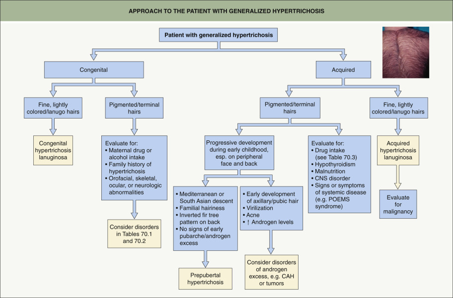 CAH, congenital adrenal hyperplasia; POEMS, p olyneuropathy, o rganomegaly, e ndocrinopathy, m onoclonal gammopathy, s kin lesions. The photograph is an example of universal hypertrichosis, which some authors view as simply exaggerated normal hairiness that may be familial.