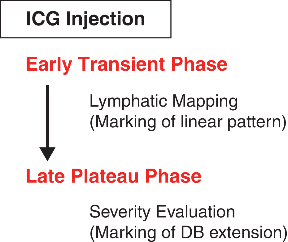 At an early transient phase, immediately after ICG injection, fluorescent images are obtained to localize the collecting lymph vessels by marking a linear pattern with a pen. Since the reticular pattern is seen only at the transient phase and eventually changes to a stardust or diffuse pattern at the plateau phase, only linear pattern should be marked at the transient phase. As lymphatic vessels’ conditions are different according to DB patterns, differentiation of stardust and diffuse patterns is important; extension of the reticular pattern should not be marked at this phase, and extensions of stardust and diffuse patterns should be separately marked at the plateau phase.