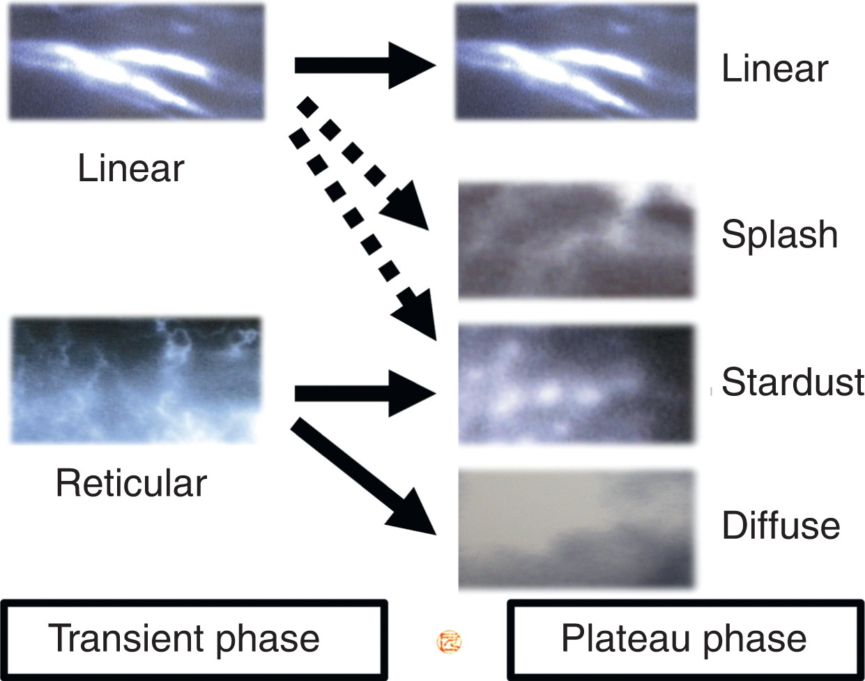 ICG lymphography findings are classified into two patterns: the normal “linear” pattern and the abnormal “dermal backflow (DB)” pattern. The DB pattern can be subdivided into “reticular,” “splash,” “stardust,” and “diffuse” patterns. The reticular pattern is an atypical DB pattern seen at an early transient phase, whereas splash, stardust, and diffuse patterns are DB patterns seen at a late plateau phase; the reticular pattern seen at a transient phase may change to a stardust or diffuse pattern at a plateau phase ( Fig. 7.2 ). The linear pattern, longitudinal lines along the axis of the extremity, represents lymph flows of the collecting lymphatic vessels, normograde lymph flows. Damage to lymph nodes or vessels, such as by lymph node dissection, radiation, trauma, or malformation, causes lymphatic hypertension, dilatation of the collecting lymphatic vessels, lymphatic valvular insufficiency, and retrograde lymph flows. Retrograde lymph flows of the superficial collecting or the precollecting lymphatic vessels are shown as a splash pattern of tortuous lines on ICG lymphography. These dilated superficial lymphatics play as collateral lymphatic pathways. When the collateral pathways fail to compensate for lymphatic overload, further retrograde lymph flows take place, leading to vertical retrograde flows toward the dermis. These vertical retrograde lymph flows are shown as spots on ICG lymphography: the stardust pattern. Finally, the collecting and precollecting lymphatic vessels can be obstructed because of lymphosclerosis, and horizontal lymph flows of the dilated lymphatic capillaries play a major role in lymph circulation. These dilated lymphatic capillaries are shown as a diffuse pattern, diffusely enhanced on ICG lymphography.