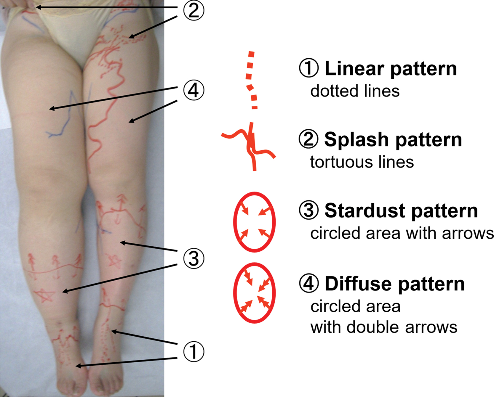At a late plateau phase, 2–72 hours after ICG injection, ICG movement reaches a plateau; for severe lymphedema cases, a patient should move the affected limbs rigorously, because it usually takes longer time for ICG movement to reach a plateau. Differentiation and extension of each DB pattern are evaluated at this phase. DB patterns are marked so that differentiation (splash, stardust, or diffuse pattern) and extension of each DB pattern are easily understood at a glance ( Fig. 7.3 ). ICG lymphography severity staging should be based on findings at a plateau phase, not based on those at a transient phase, as described later.