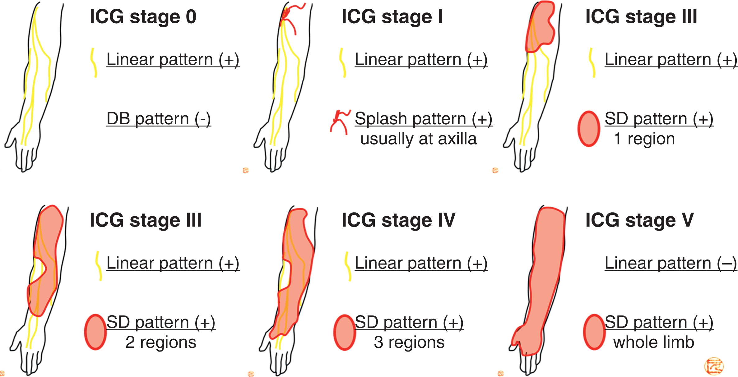 Pathophysiologic ICG lymphography stages, or modified DB stages for secondary lymphedema, are determined according to the visibility of a linear pattern and the extension of DB patterns. The ICG stage is applicable for secondary lymphedema of the upper extremity, the lower extremity, the face/head/neck, and the lower abdomen/genitalia. ICG staging consists of stage 0 through stage V ( Table 7.1 ).