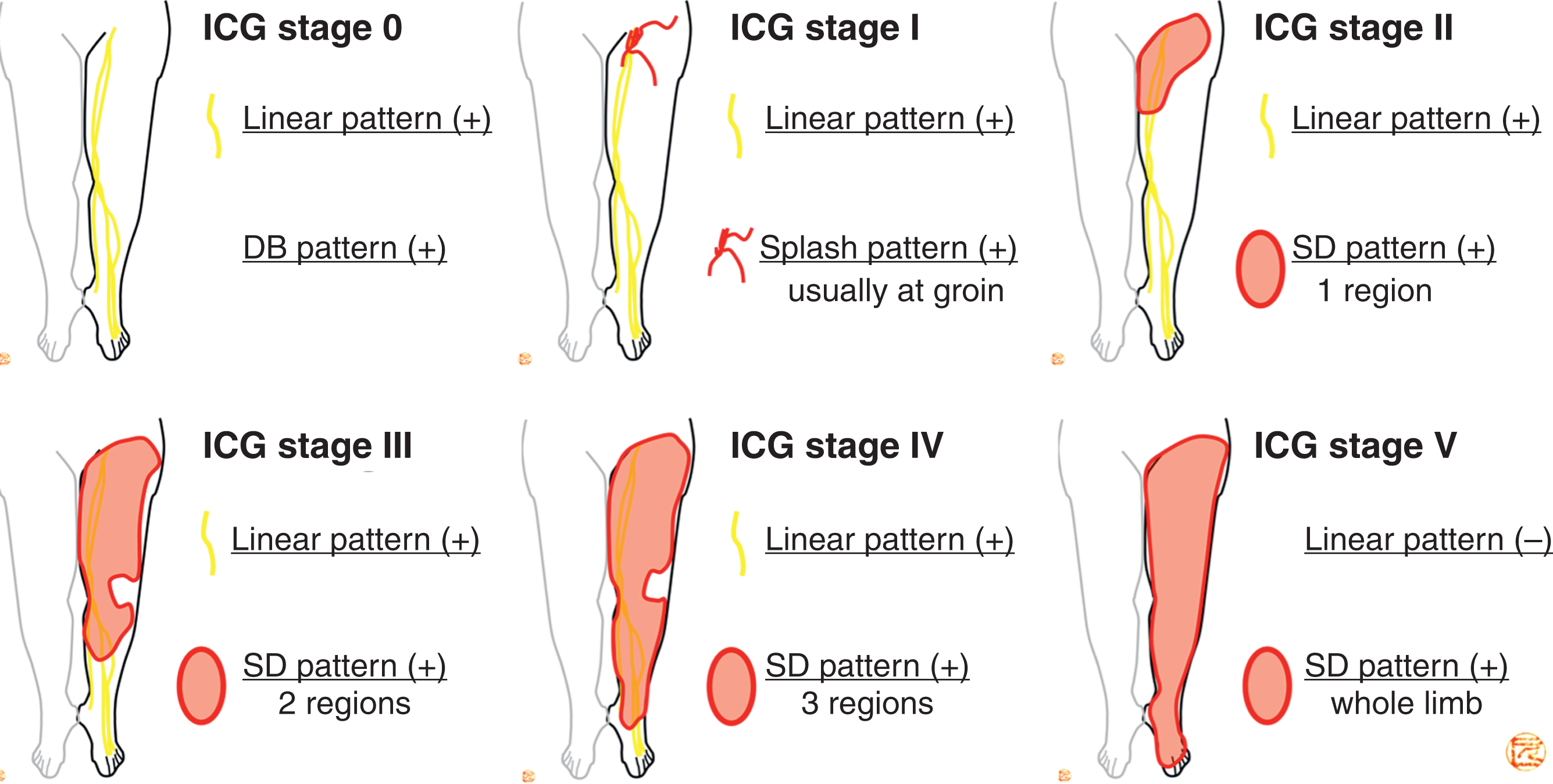 In ICG stage 0, only the linear pattern is seen, and no DB pattern is detected—no lymphedema. In ICG stage I, the splash pattern is seen in addition to the linear pattern and is usually observed in the region most proximal to the obstruction site, such as the groin for lower extremity lymphedema secondary to pelvic lymph node dissection. ICG stage I represents subclinical lymphedema; around 30% of subclinical lymphedema cases spontaneously down-stage to stage 0 without any treatment, whereas the remaining 70% stay in stage I or progress to stage II. In ICG stage II–IV, the linear pattern and the stardust/diffuse (SD) pattern are observed. One region shows an SD pattern in ICG stage II, two regions in ICG stage III, and three regions in ICG stage IV. In ICG stage V, the SD pattern is seen in all regions, and the linear pattern is not detected; the difference between ICG stage IV and stage V is the visibility of the linear pattern. ICG stage II represents early lymphedema, while ICG stage III–V represents progressed lymphedema ( Figs. 7.4 and 7.5 ).